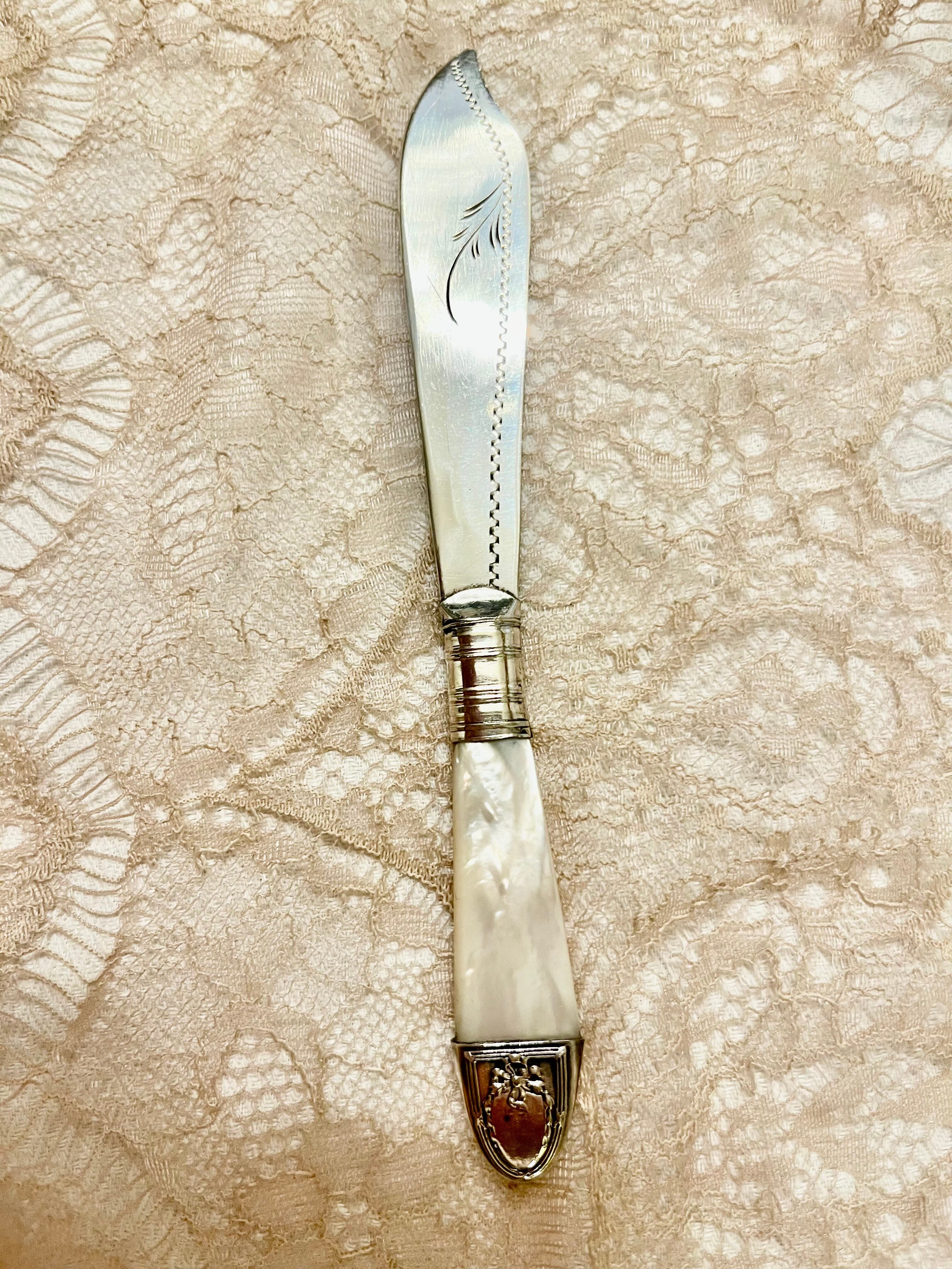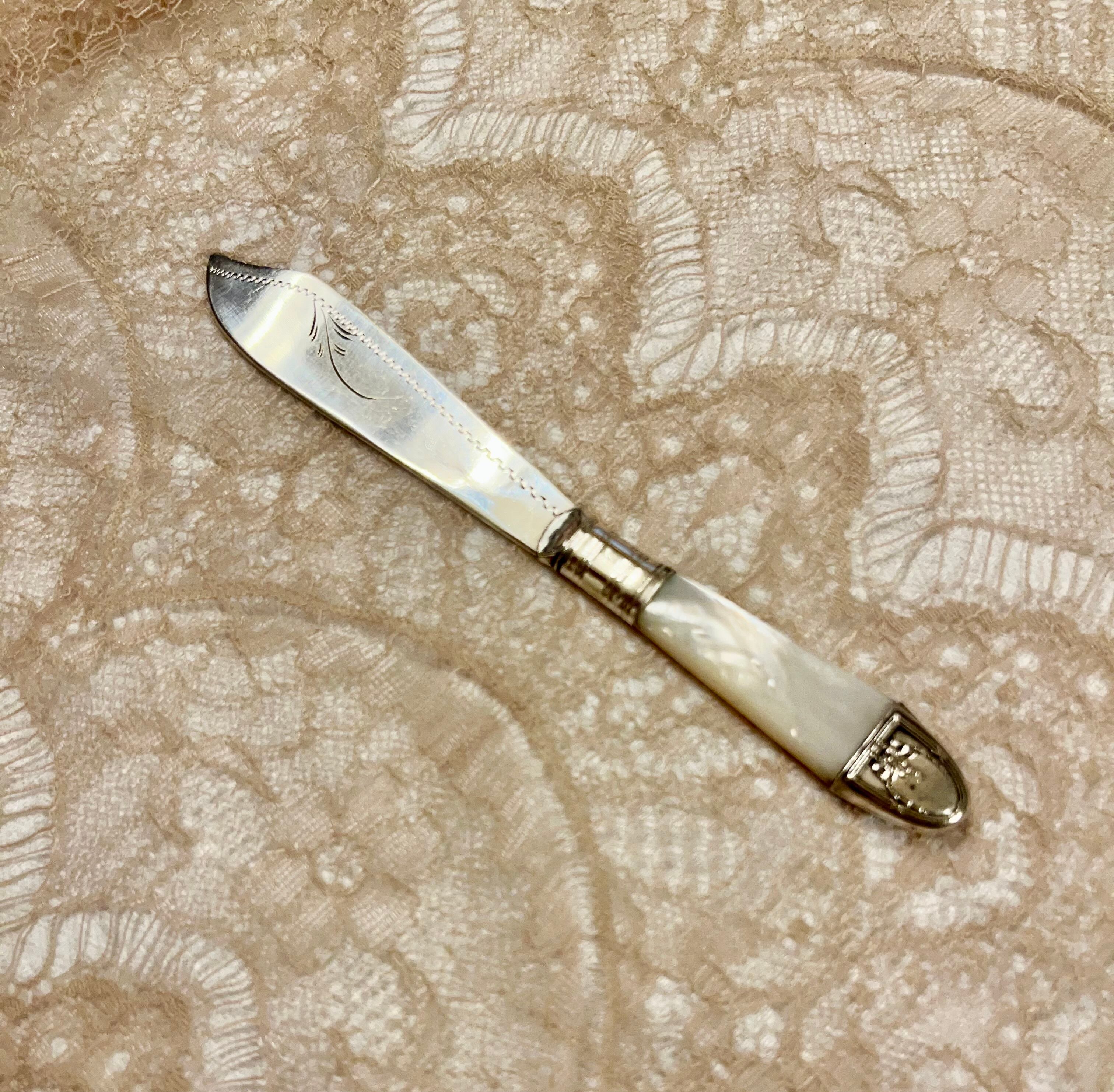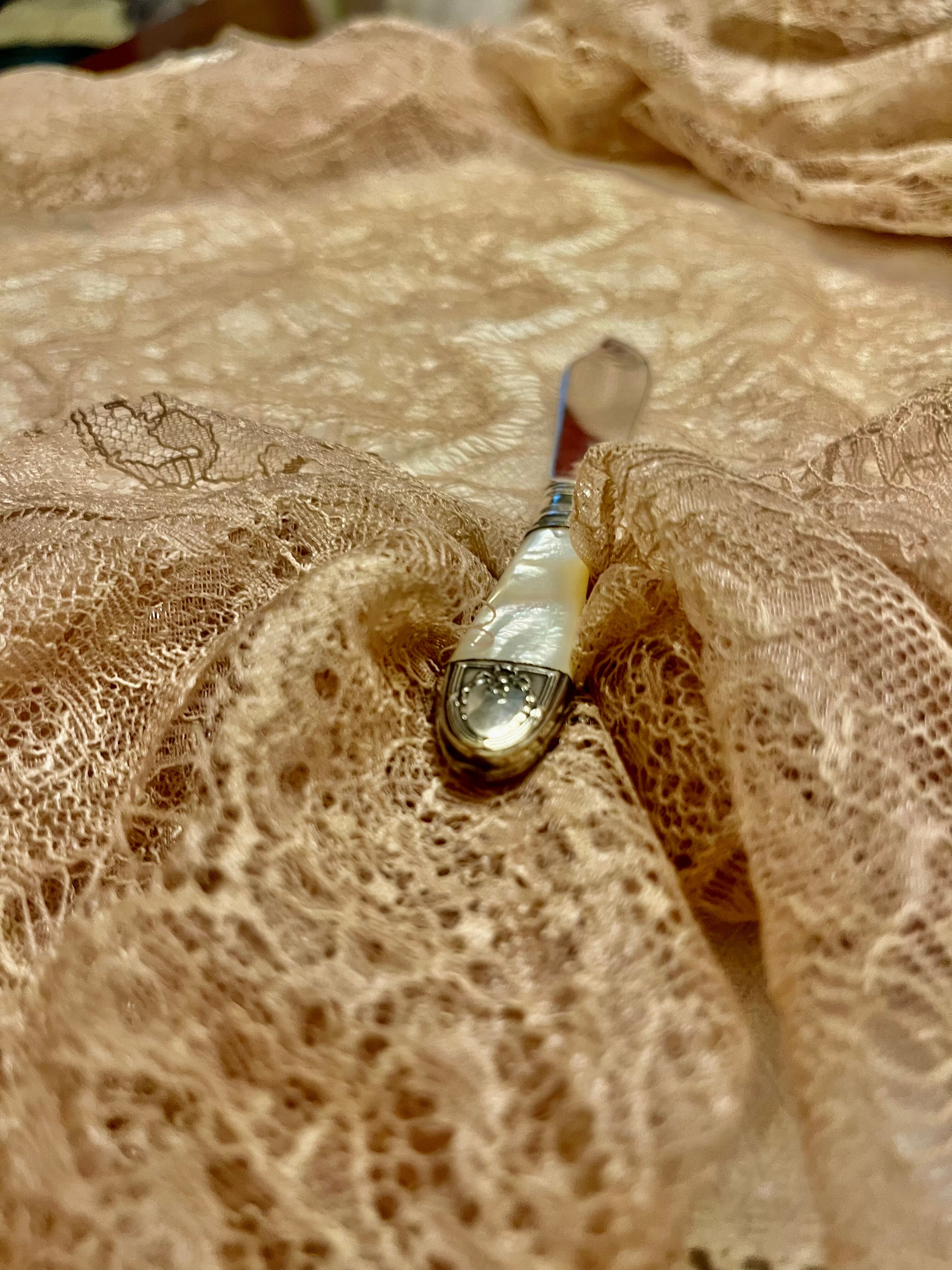 こちらもパリ蚤の市で見つけた,マザーオブパールハンドルのバターナイフです。
