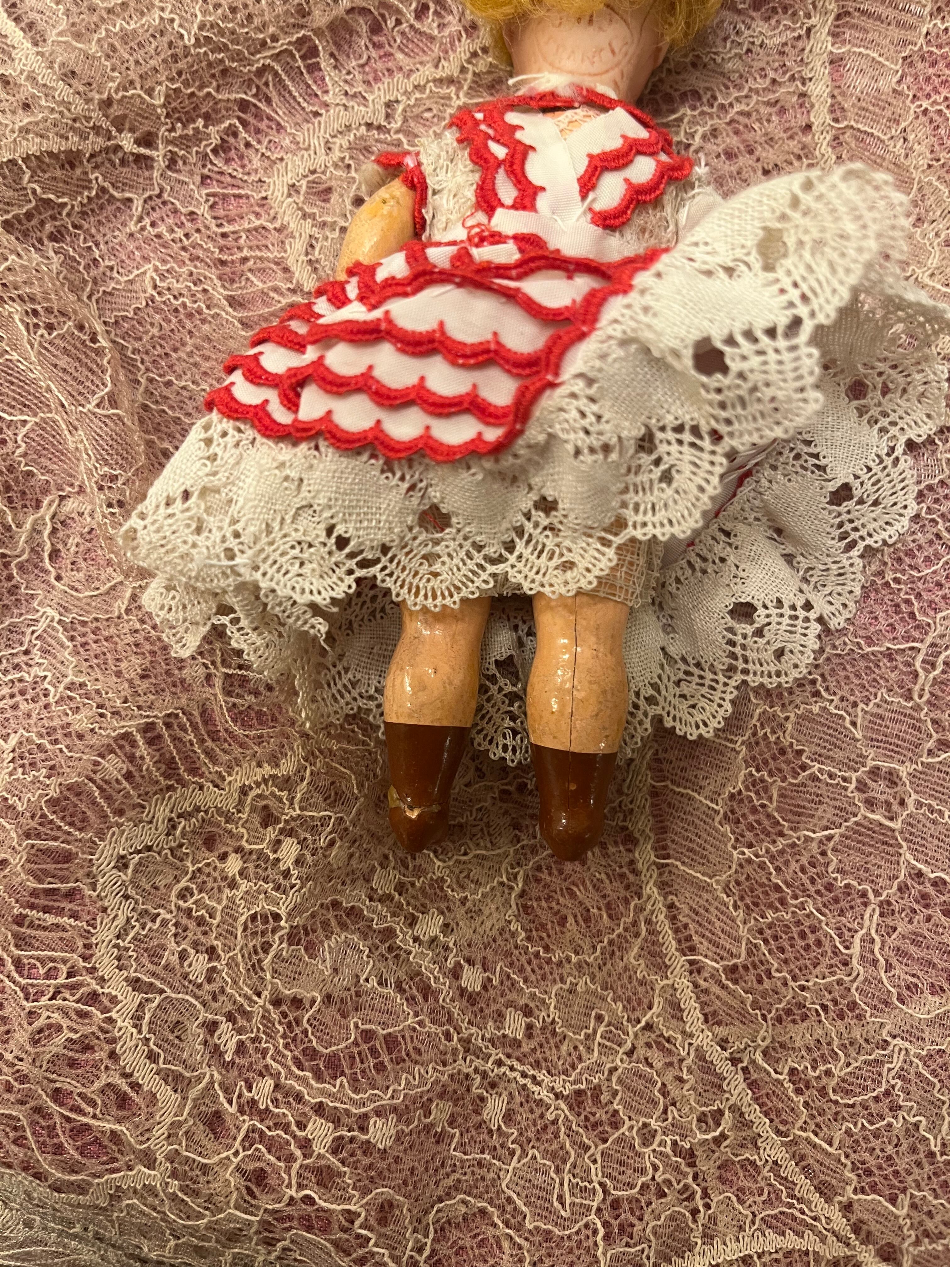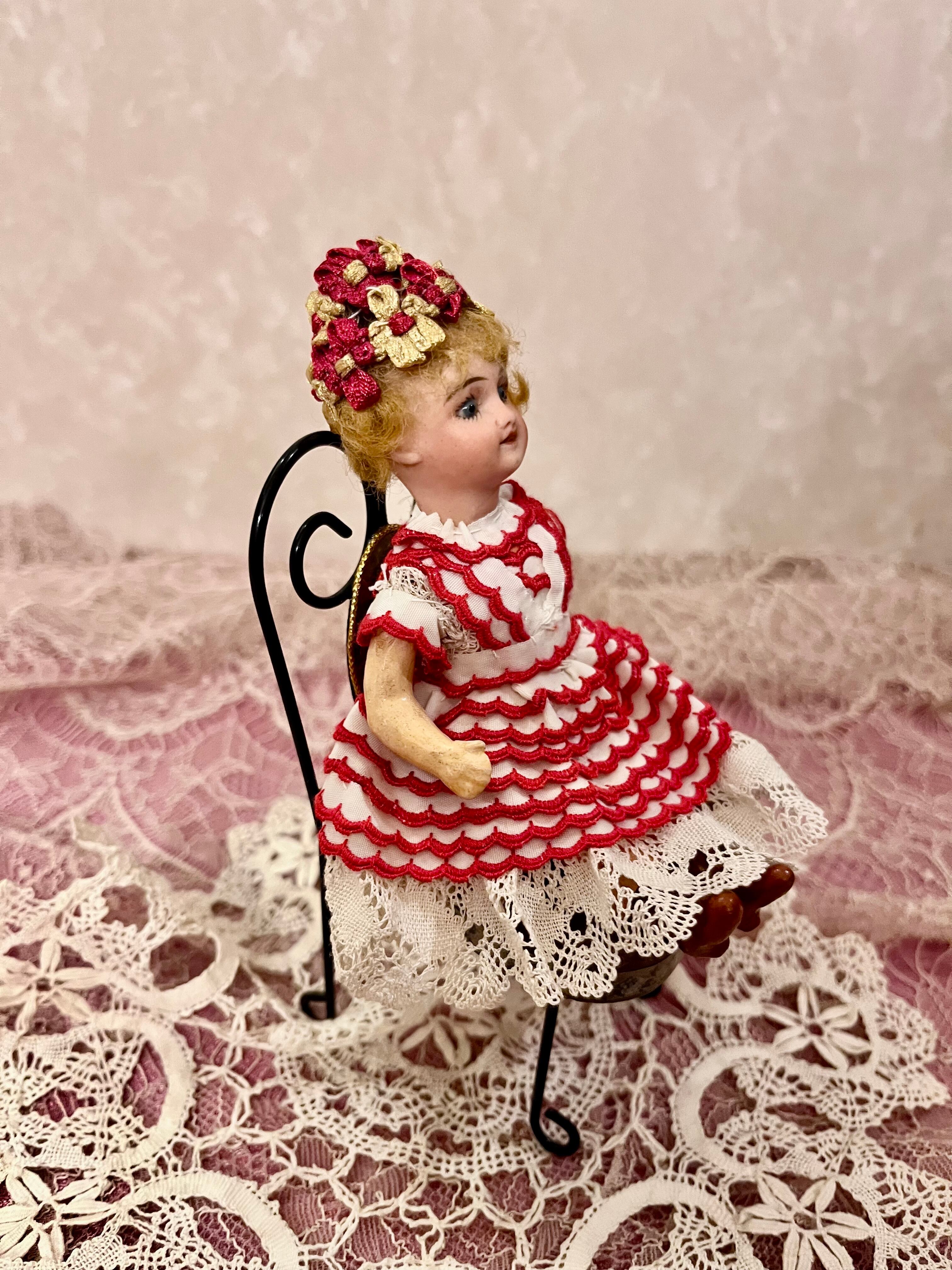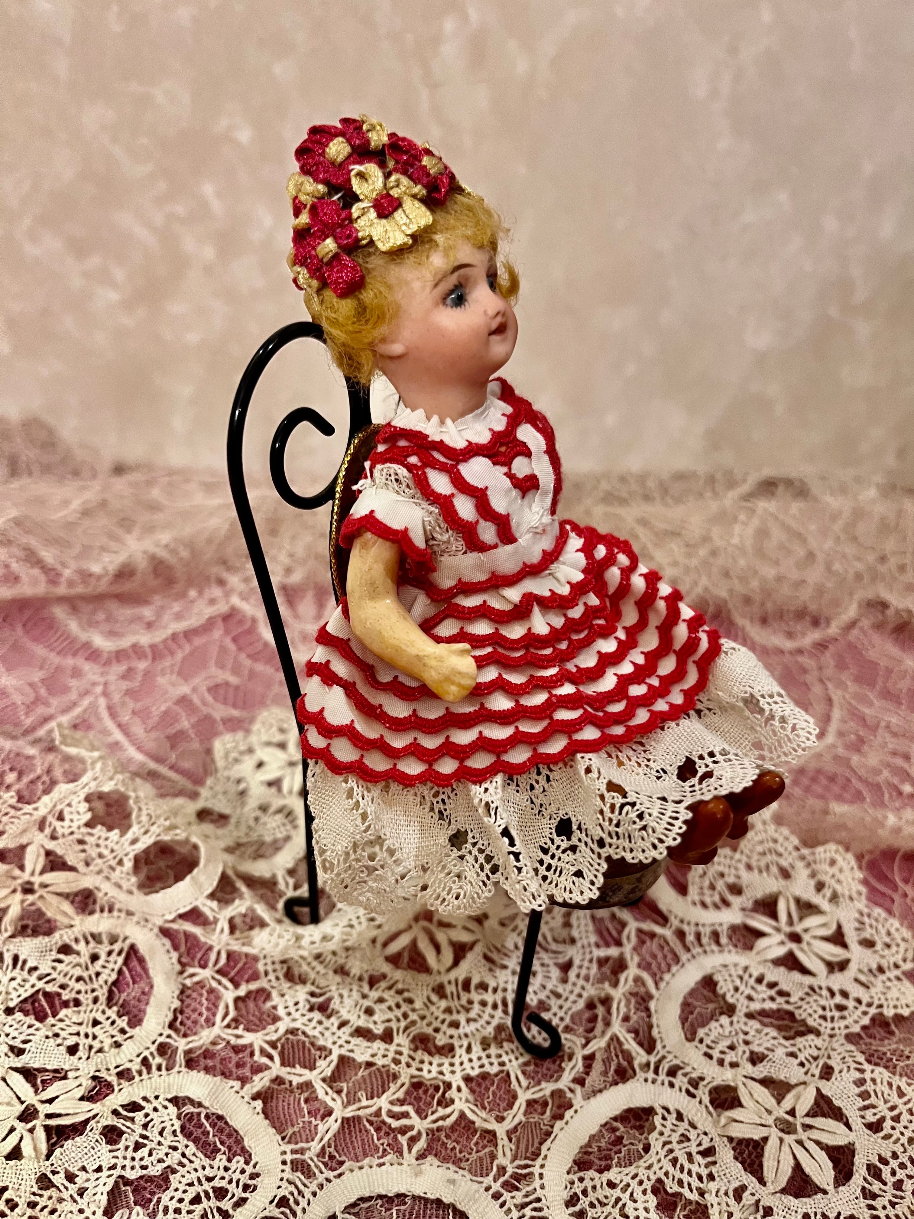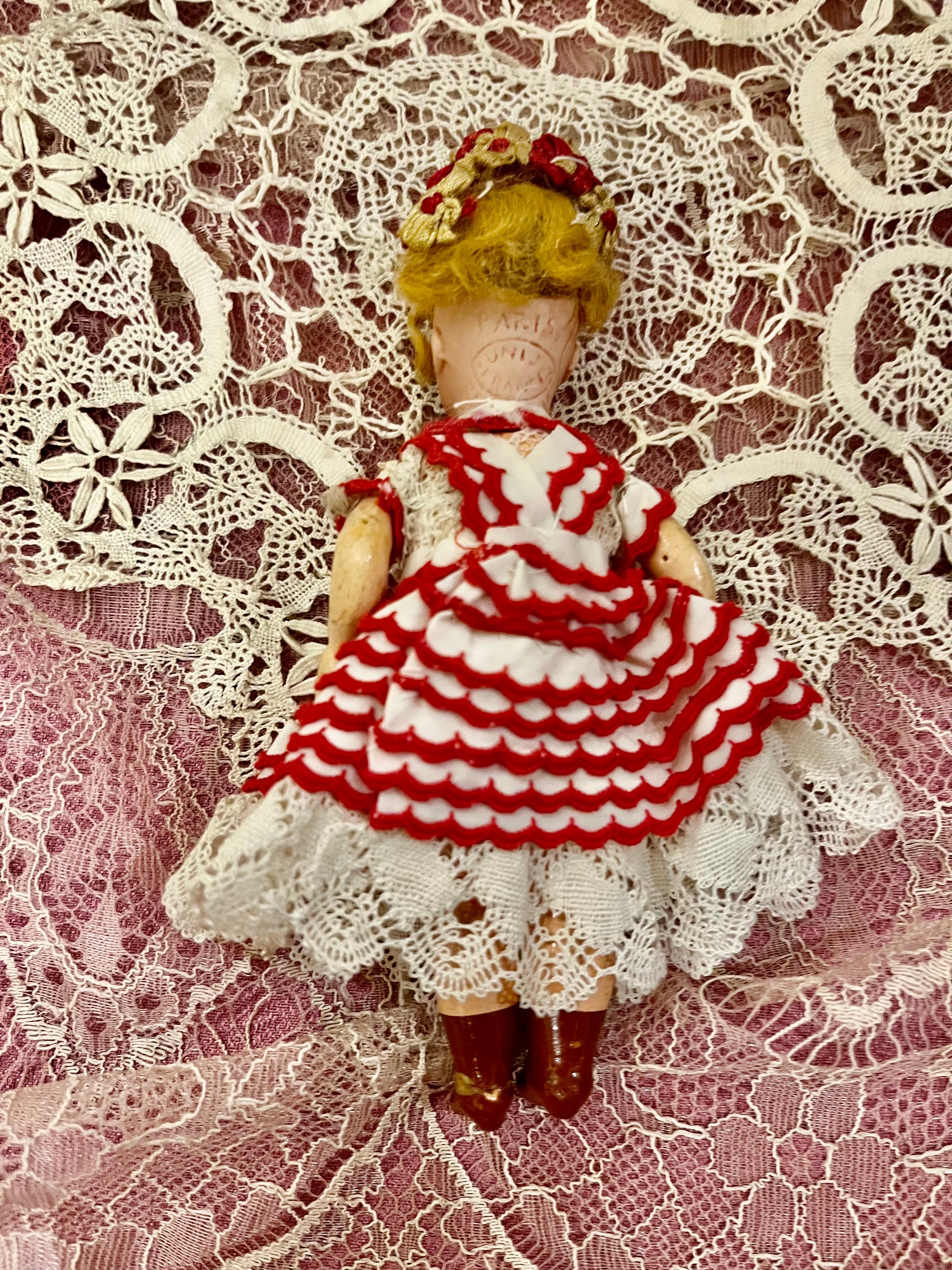 衣装は近年の製作のようですが、ロココリボンのボネ、スカラップ刺繍のリボンとアンティークレースで作られたドレスも素敵ですね。