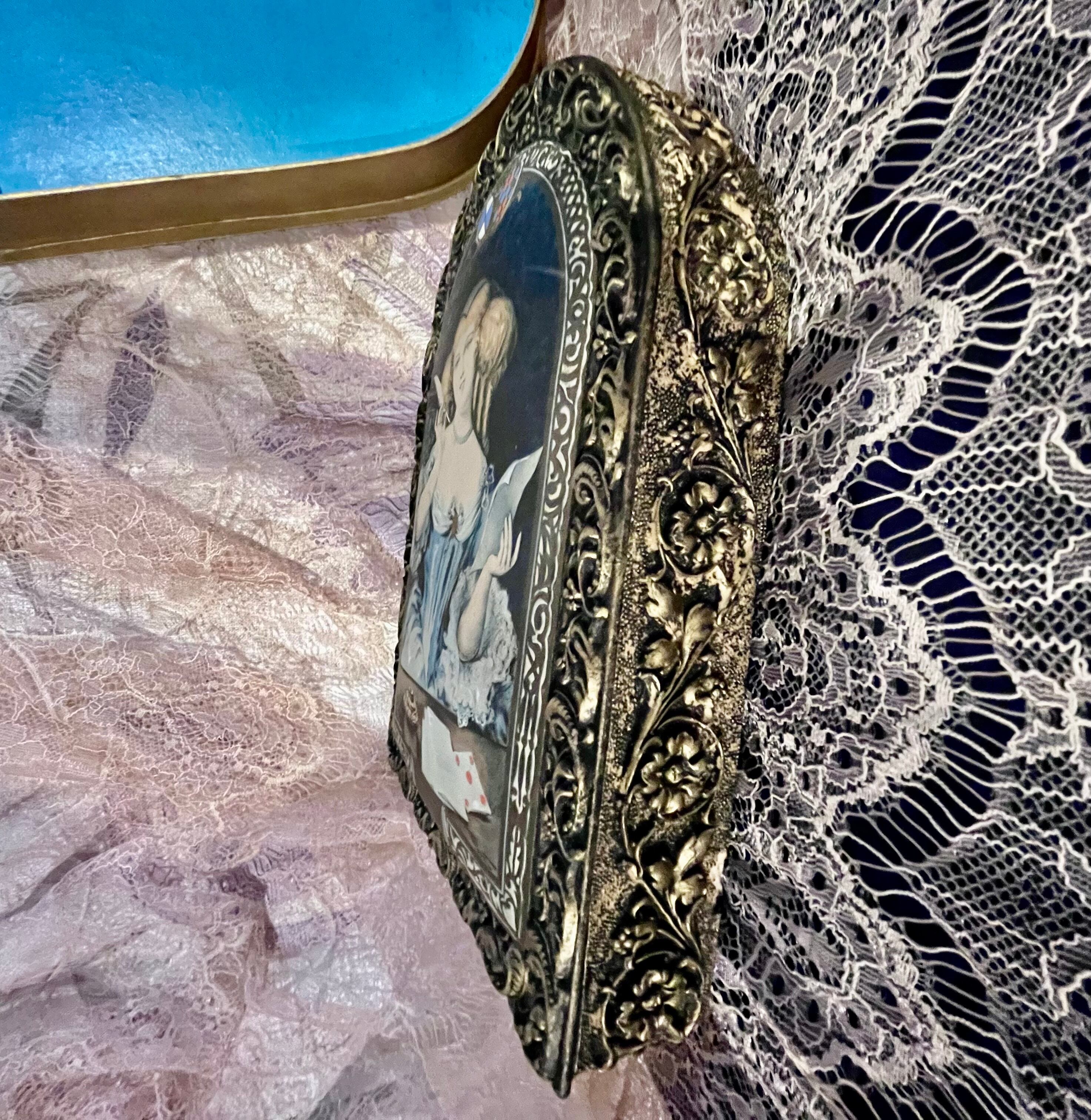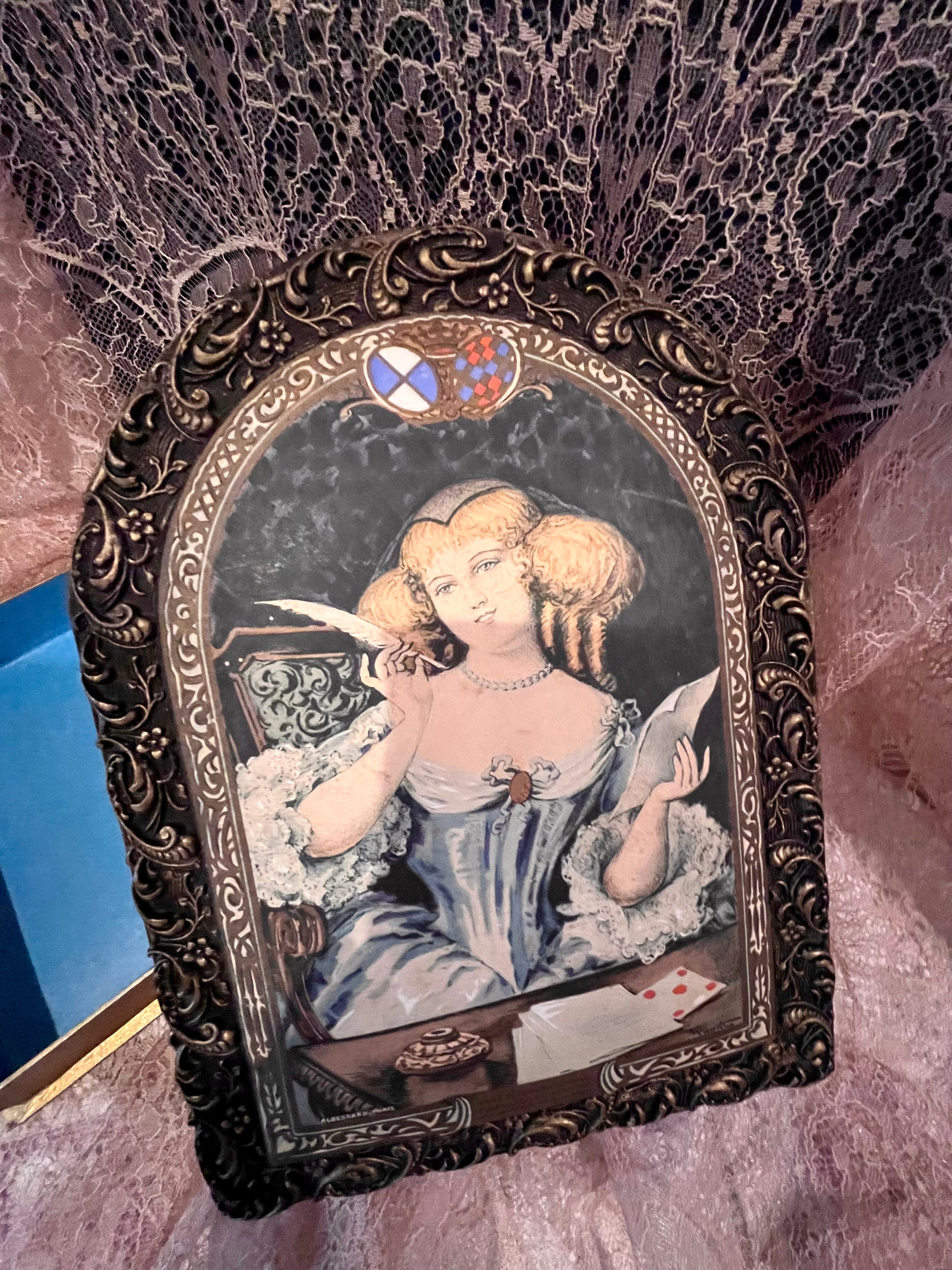 重厚感のあるメタル装飾フレームに、クラシックな女性画が施された上品なデザイン。